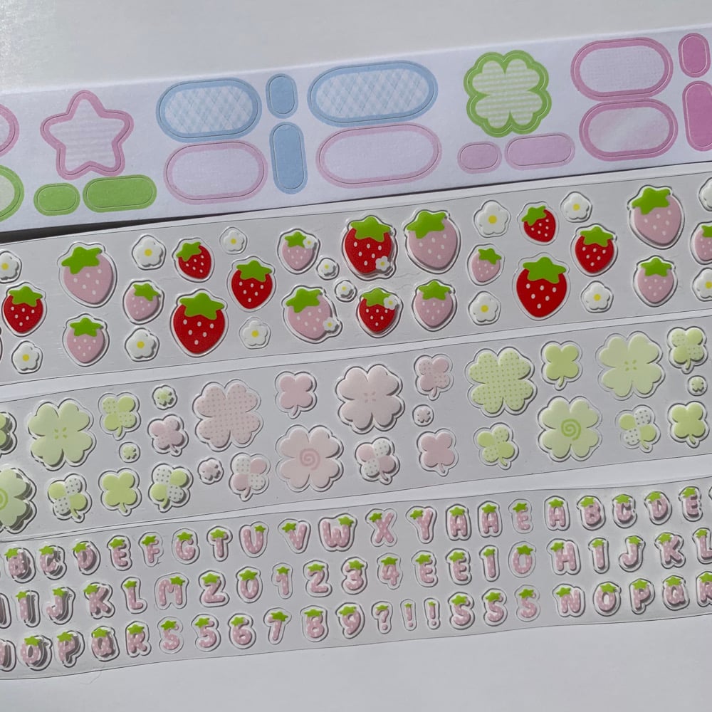 ↳ choose from strawberry alphabet, lucky clover, and strawberry fields, writeable sticker tape OR get them all!